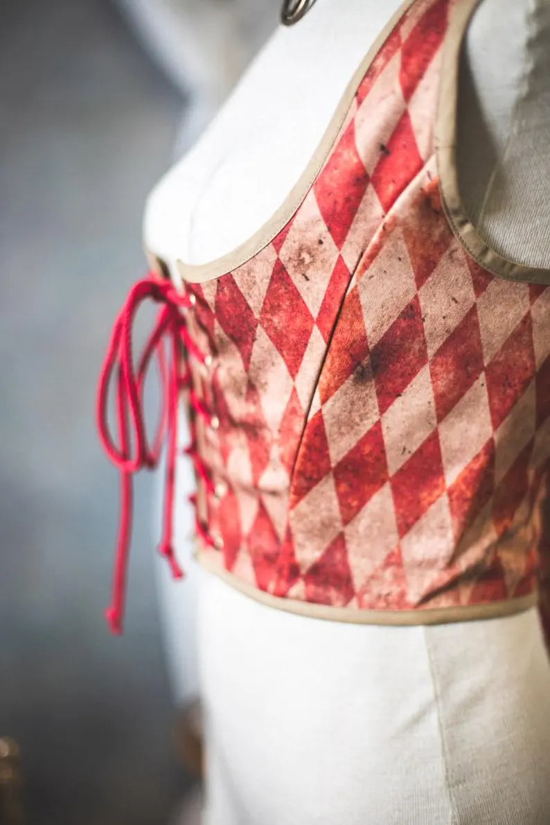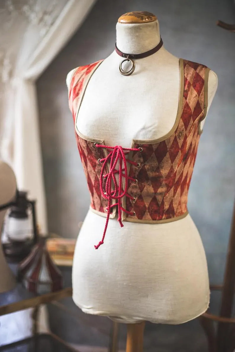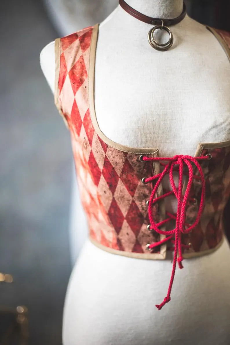 Hay prendas que no necesitan presentarse. Este corpiño de rombos habla por sí solo: audaz, elegante y con ese aire circense que conquista sin esfuerzo. Su cordón rojo al frente acentúa la figura y añade un toque de teatralidad irresistible.
