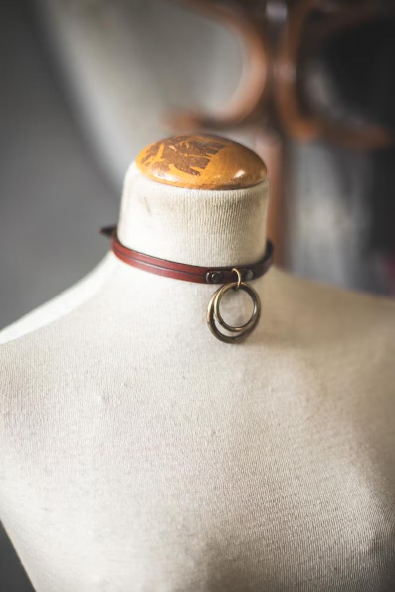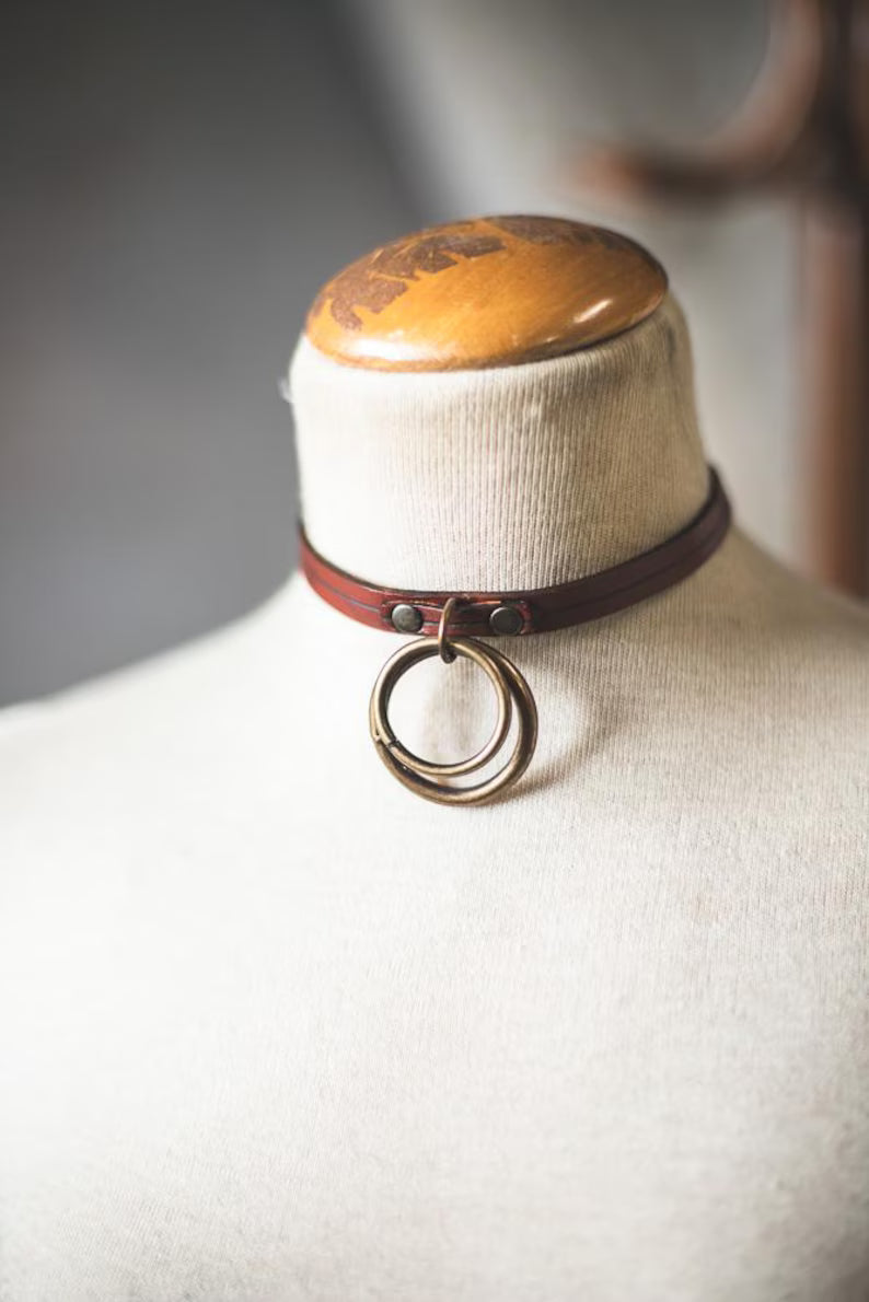 Bajo las luces del circo, cada detalle cuenta. Nuestra gargantilla de cuero marrón con argolla es la pieza perfecta para dominar la pista con elegancia y carácter. Esta pieza esta confeccionada con cuero y es regulable.