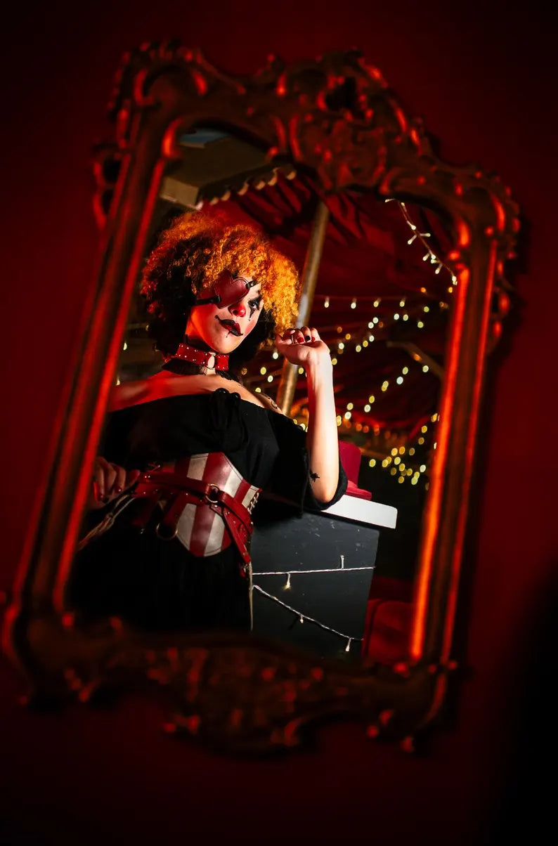 Con sus rayas verticales al estilo de la gran carpa, este corsé celebra el encanto del circo antiguo con una silueta irresistible. Ajusta y realza la figura con elegancia, convirtiéndose en la pieza central de cualquier atuendo.