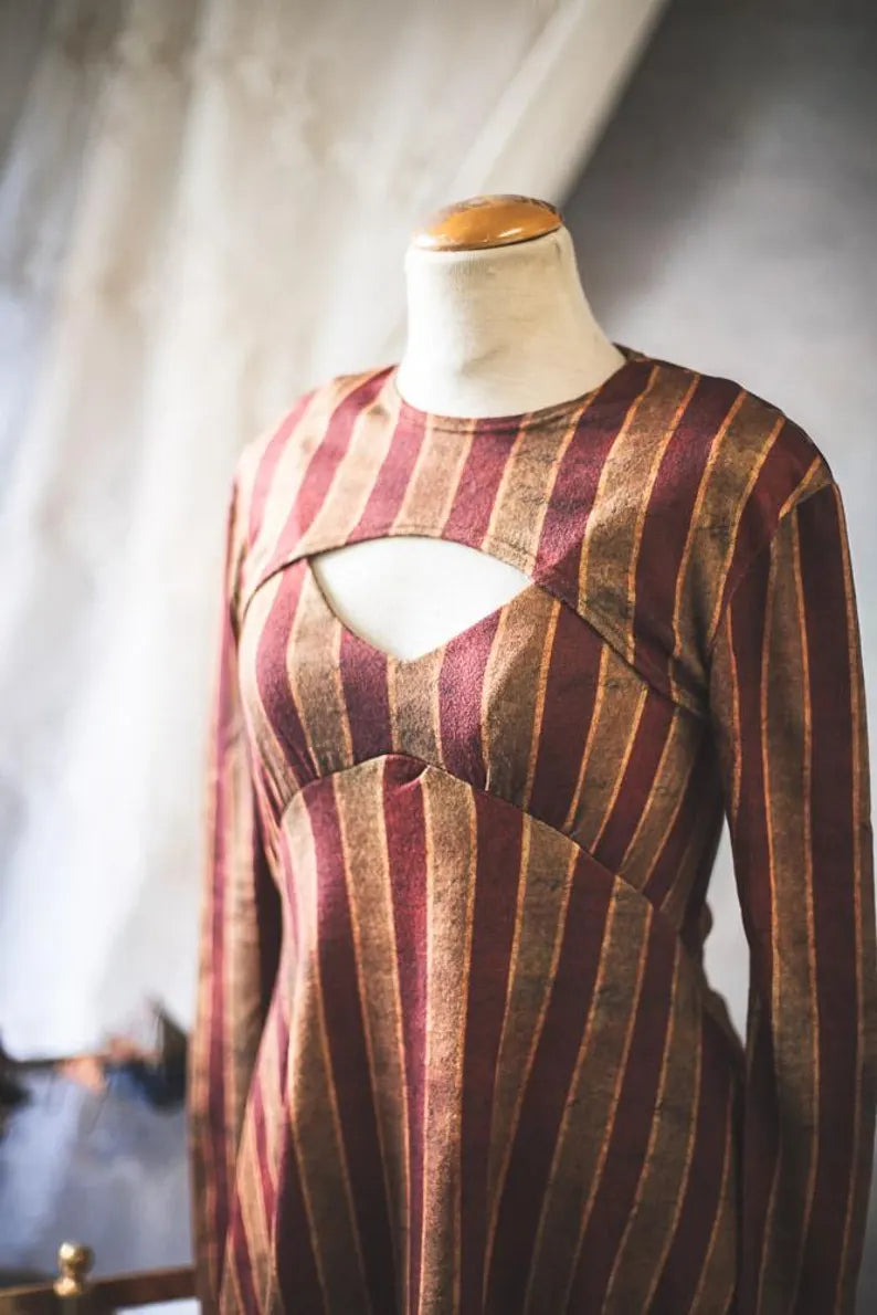 A rayas como la gran carpa del circo, este vestido irradia vida en cada movimiento. Sus franjas rojas y amarillas evocan la emoción de la pista y el espíritu audaz de quien no teme ser el centro de atención. Ligero, cómodo y lleno de carácter, es una pieza que celebra la alegría del show.